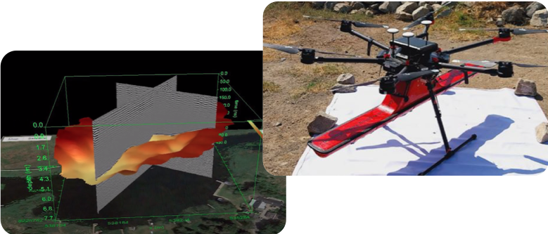 Vuelos con un dron de alta gama que transporta un sistema geofísico GPR (Ground Penetrating Radar), el cual permite detectar acuíferos (aguas subterráneas) y cuerpos bajo tierra como tuberías, rocas, etc. Además, hace posible detectar anomalías, como fugas en estanques, tuberías y tranques. Esta tecnología permite una medición a nivel de subsuelo de hasta 120 metros de profundidad.