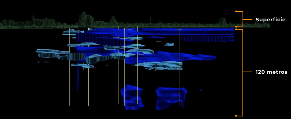 En la imagen adjunta podemos observar nuestros resultados, un modelo 3D de los acuíferos identificados, con un alcance de hasta 120 metros de profundidad.