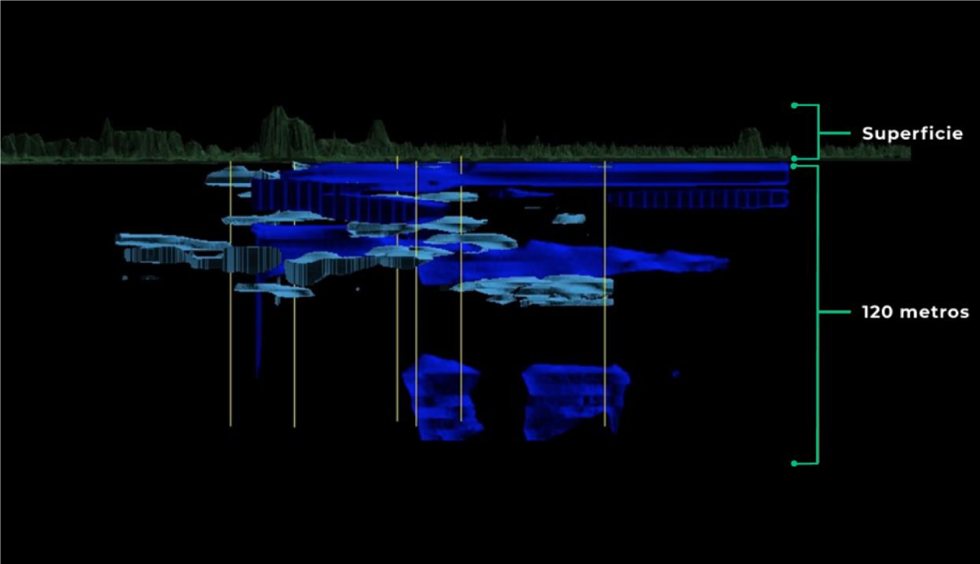 En la imagen adjunta podemos observar nuestros resultados, un modelo 3D de los acuíferos identificados, con un alcance de hasta 120 metros de profundidad.