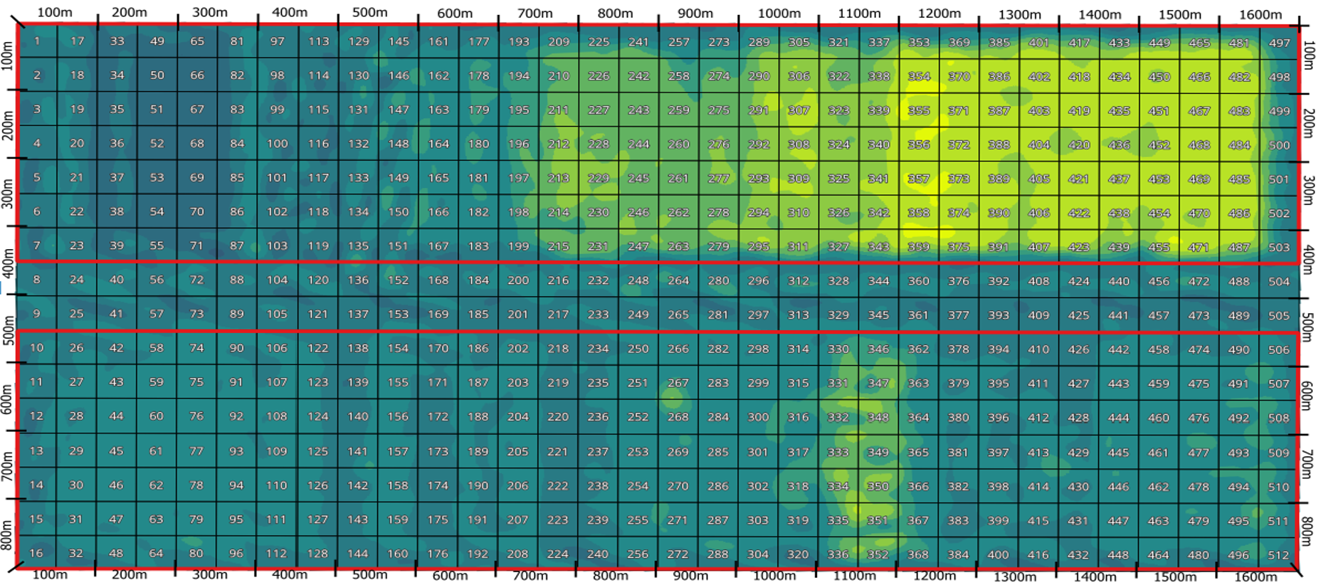 Humedad detallada con división en zonas y cuadrícula de 50 metros.